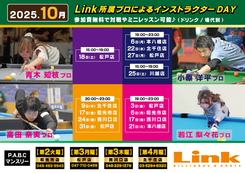 10月のビリヤードインストラクターDAY ニュース&イベント情報 2025.10.012025.10.10 インストラクターDAYは特別な費用がなくプロと対戦/ミニレッスンが可能!これから始めたい方やグループでのミニレッスンも可能ですのでお気軽にご参加ください♪新しい趣味にもおススメです! この記事が気に入ったらいいね ! しようシェアするツイートする