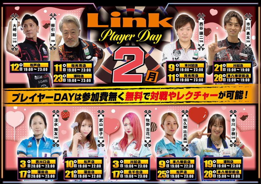 2月のダーツプレイヤーDAY! ニュース&イベント情報 2026.01.27 2月のLinkオフィシャルプレイヤーDAYプレイヤーDAYは参加費無料でプロと対戦やミニレッスンが可能!! 早い時間帯はグループでパーティーゲームで遊べたりダブルス出来たりと対戦だけではなく楽しめちゃいます✨ぜひこの機会に行かれたことのないLinkのお店にもぜひご来店ください♪ この記事が気に入ったらいいね ! しようシェアするツイートする